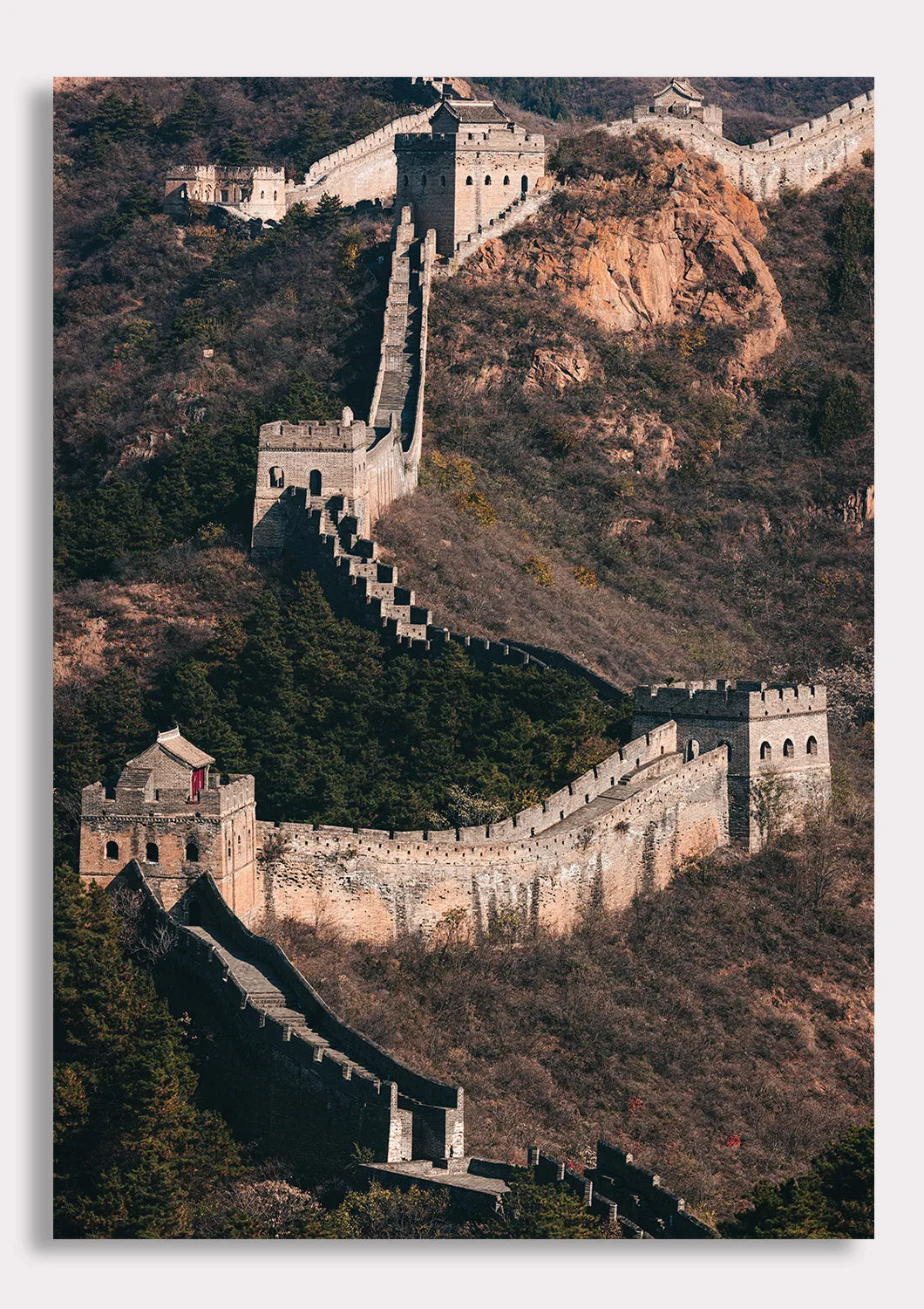 Zoom in on the textured strength of the Great Wall: this close-up portrait emphasises the weathered stones, solid tower, and architectural detail of this iconic landmark. The intimate framing highlights craftsmanship and endurance — every brick tells a story of centuries past. Ideal for interior spaces that require a powerful yet contemplative presence, this print celebrates human achievement and the timeless beauty of ancient architecture.